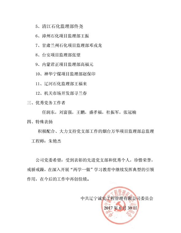 為慶祝中國(guó)共產(chǎn)黨建黨96周年,公司黨委于2017年6月30日下午在公司一樓會(huì)議室召開了慶祝建黨96周年暨“一優(yōu)兩先”表彰視頻大會(huì)。公司機(jī)關(guān)、撫順各項(xiàng)目監(jiān)理部及在撫的黨員同志在主會(huì)場(chǎng)參加了大會(huì),中海油惠州項(xiàng)目監(jiān)理部黨支部、甘肅華亭項(xiàng)目監(jiān)理部黨支部、寧夏石化項(xiàng)目監(jiān)理部黨支部、中化泉州項(xiàng)目監(jiān)理部黨支部、廣西石化項(xiàng)目監(jiān)理部黨支部、蘭州石化項(xiàng)目監(jiān)理部黨支部、內(nèi)蒙古君正項(xiàng)目監(jiān)理部黨支部、神華寧煤項(xiàng)目監(jiān)理部黨支部、煙臺(tái)萬華項(xiàng)目監(jiān)理部黨支部設(shè)立視頻分會(huì)場(chǎng)。黨委委員馬駿主持了視頻大會(huì)。首先,公司黨委副書記馮玉琢同志宣讀了“一優(yōu)兩先”表彰決定。接著,黨委書記孫學(xué)良結(jié)合公司實(shí)際做了慶祝建黨96周年的講話。最后全體黨員重溫的入黨誓詞,進(jìn)行入黨宣誓。