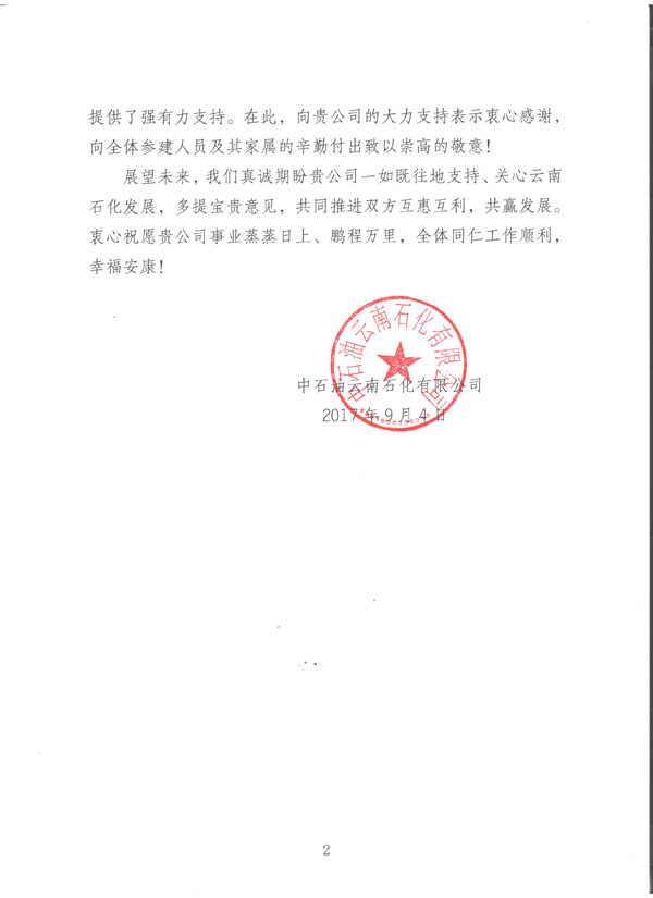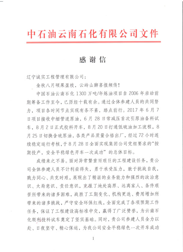 公司于今日收到由中國石油云南石化有限公司發(fā)給我方的《感謝信》一封,信中提到:對于我方所監(jiān)理服務(wù)的煉油項目自2006年啟動籌備工作至今,我方監(jiān)理人員不計利益得失,勇于承受壓力,使得該項目近日順利投產(chǎn)試車成功。對于我單位的工作給予極大的肯定以及衷心的感謝。對方還提到:希望雙方在日后的共同發(fā)展中,互惠互利,共贏發(fā)展。