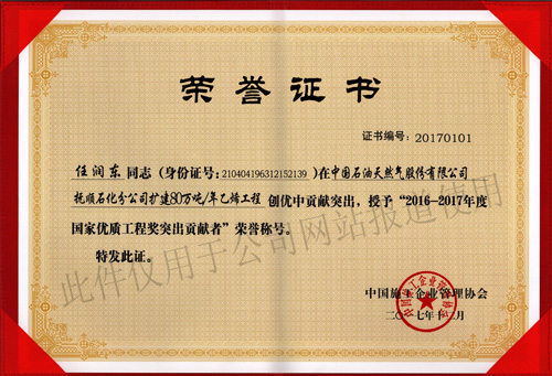 2017年11月10日,根據(jù)中施企協(xié)字【2017】66號文件——《關(guān)于表彰2016-2017年度國家優(yōu)質(zhì)工程獎的決定》公告,我單位所監(jiān)理的“中國石油天然氣股份有限公司撫順石化分公司擴(kuò)建80萬噸/年乙烯工程”榮獲2016-2017年度國家優(yōu)質(zhì)工程獎,該項(xiàng)目總監(jiān)“任潤東”還獲得了“2016-2017年度第二批國家優(yōu)質(zhì)工程獎突出貢獻(xiàn)者”的榮譽(yù)稱號。