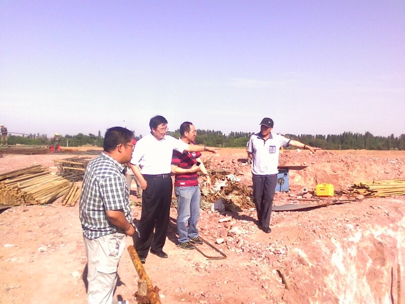 七月八日公司領(lǐng)導(dǎo)來騰格里項(xiàng)目視察,總經(jīng)理孫學(xué)良(左二)等公司領(lǐng)導(dǎo)在水源地泵站詢問進(jìn)展工程情況